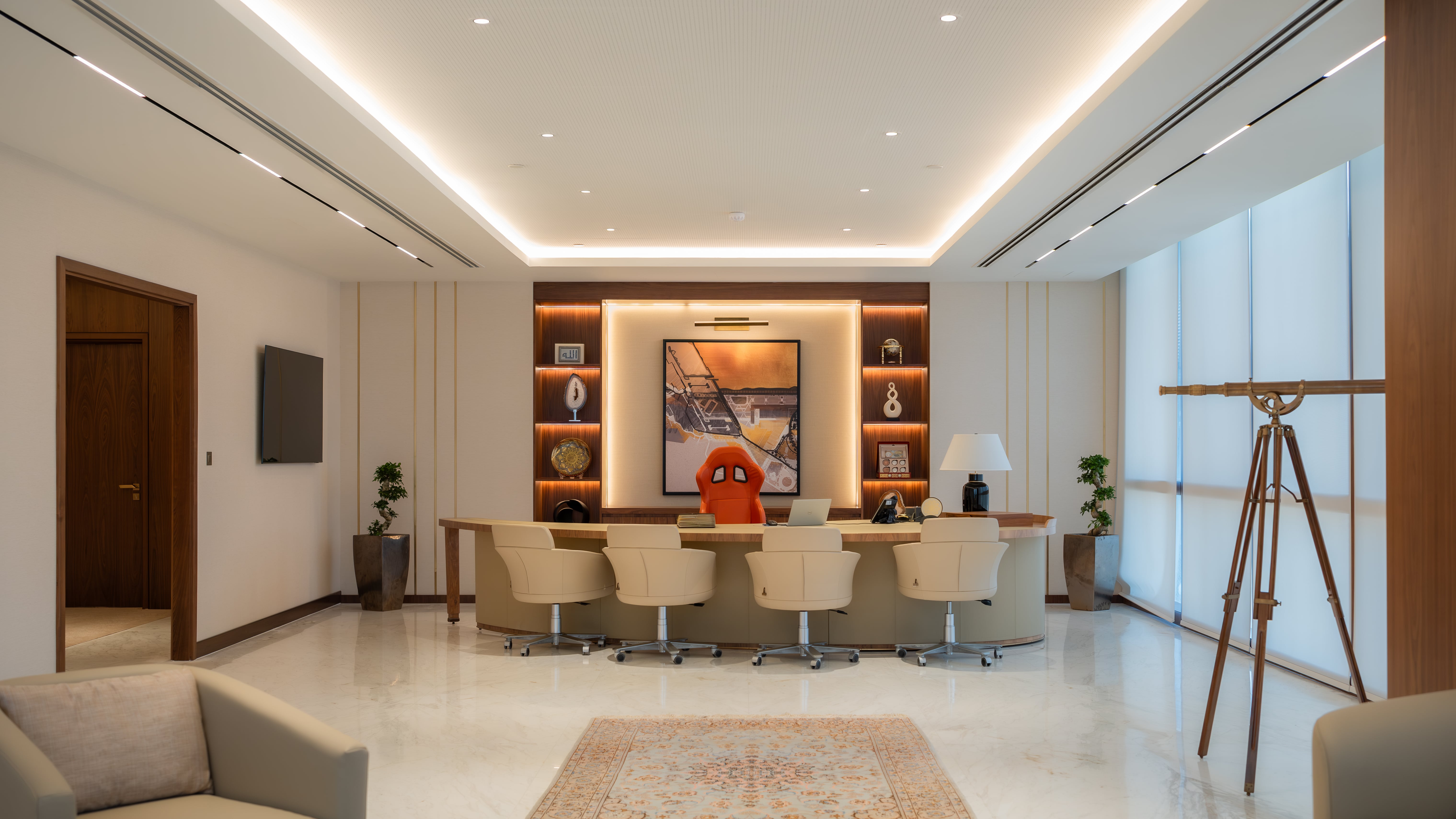 In collaboration with Jameel Showroom as the contractor, the project seamlessly transitions upward to the next two floors, which cater to the best of the best. Executive offices, including the CEO’s domain, and expansive meeting rooms designed for pivotal decisions, exude sophistication and authority. This is where most of the new budget breathes life into luxurious, high-impact spaces.