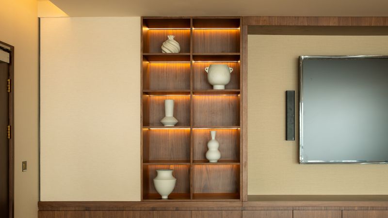 A unique challenge we embraced was the integration of Katara’s mockup hotel rooms—miniature showrooms that depict their hospitality excellence. Our mission: to creatively repurpose these spaces, blending them into the new environment while maintaining their original charm. By correlating functions, we crafted spaces that are both familiar and refreshingly innovative. The material room, present on both the office and leisure floors, is transformed into an experience center. Here, visitors embark on a journey through Katara Hospitality’s rich story, transitioning seamlessly through spaces designed to captivate and inform.