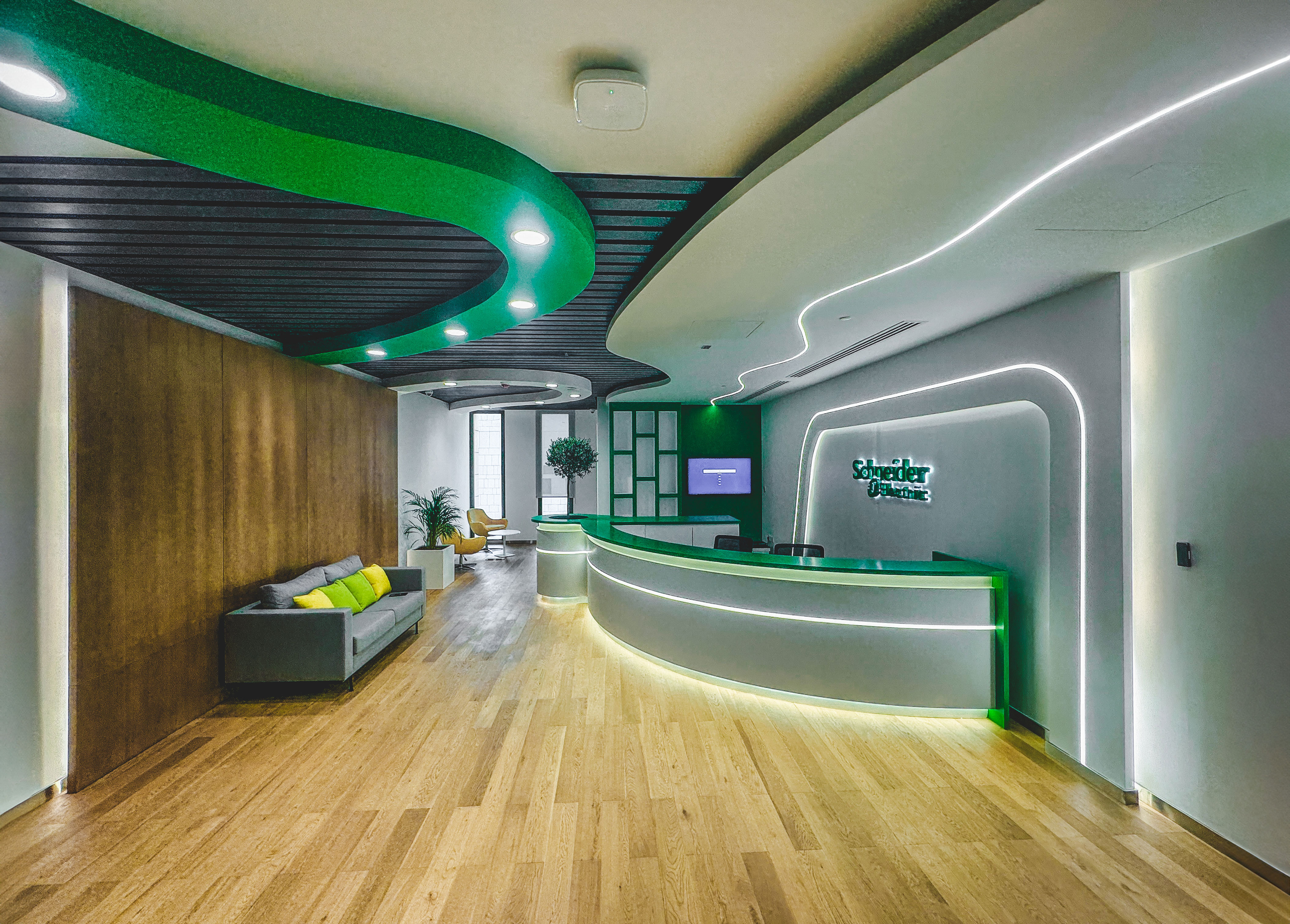 Daya took on the challenge, offering a full suite of services including commercial interior design, fitout and construction management, MEP engineering, brand expression, and tech integration. Inspired by organic elements and coordinated geometry, we optimized the office space to reflect Schneider Electric’s branding, incorporating green elements and natural greenery.